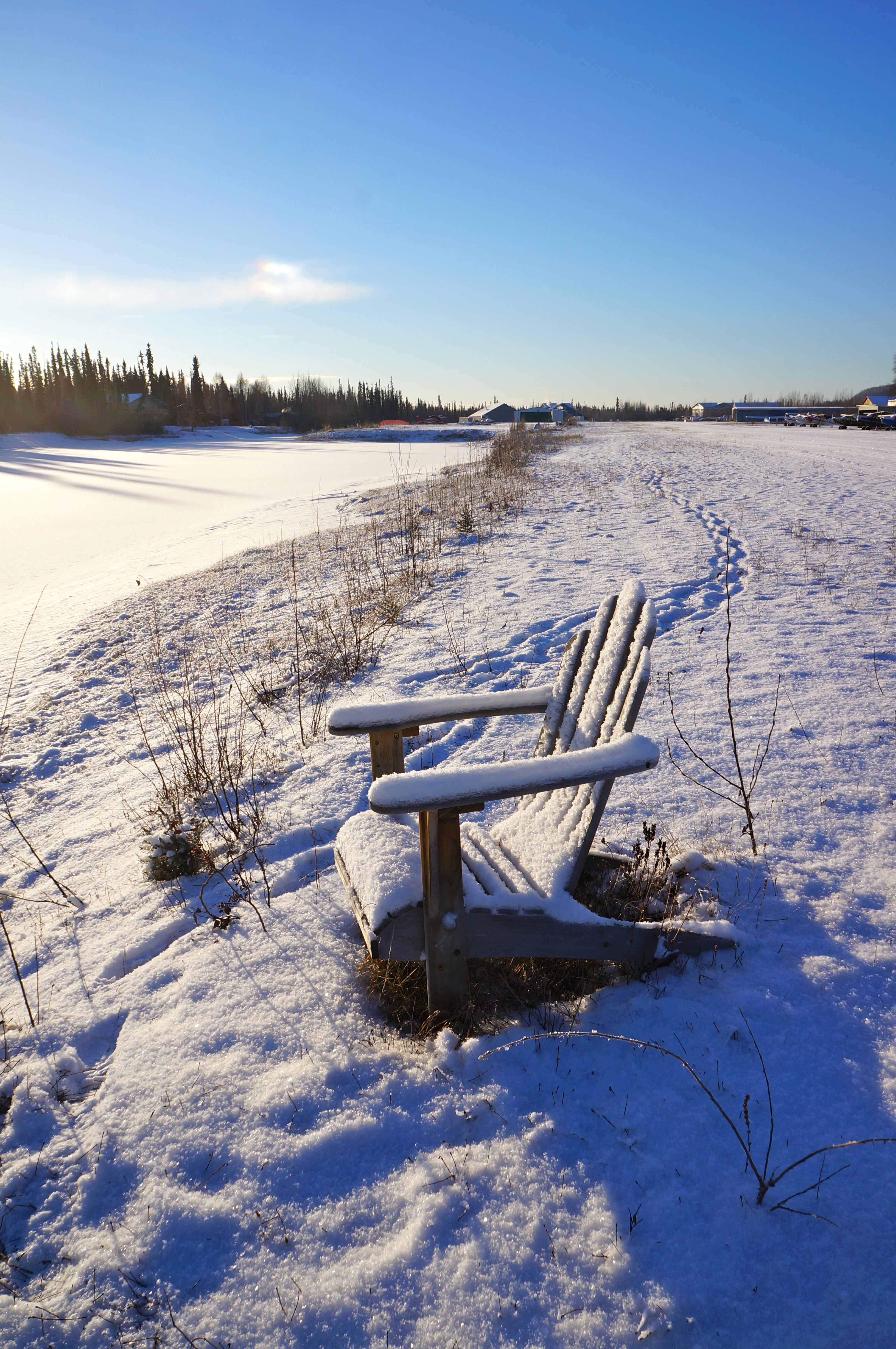 Up ahead, at the edge of the float pond an Adirondack chair casts long blue shadows in the snow, an indication that it’s close to three in the afternoon and the sunlight is about to bail on us.  Covered with ice frost and facing out toward the frozen water, it looks as if someone has actually been sitting in the chair, basking in what remains of, the blinding, heatless sun.  We plunk down little r on the seat and call him “Le Petit Prince.”  The temperature is dropping rapidly; we’re feeling it in our lungs now, shallow breathing, coughing.  And then, directly across the pond from the princely throne a team of sled dogs races by, pulling a musher on a 4×4 ATV.  We hear him shout “Hike!” and the dogs speed up, yelping happily.  Clearly, they love sprinting in the snow, which has just turned powder blue, my favorite color.