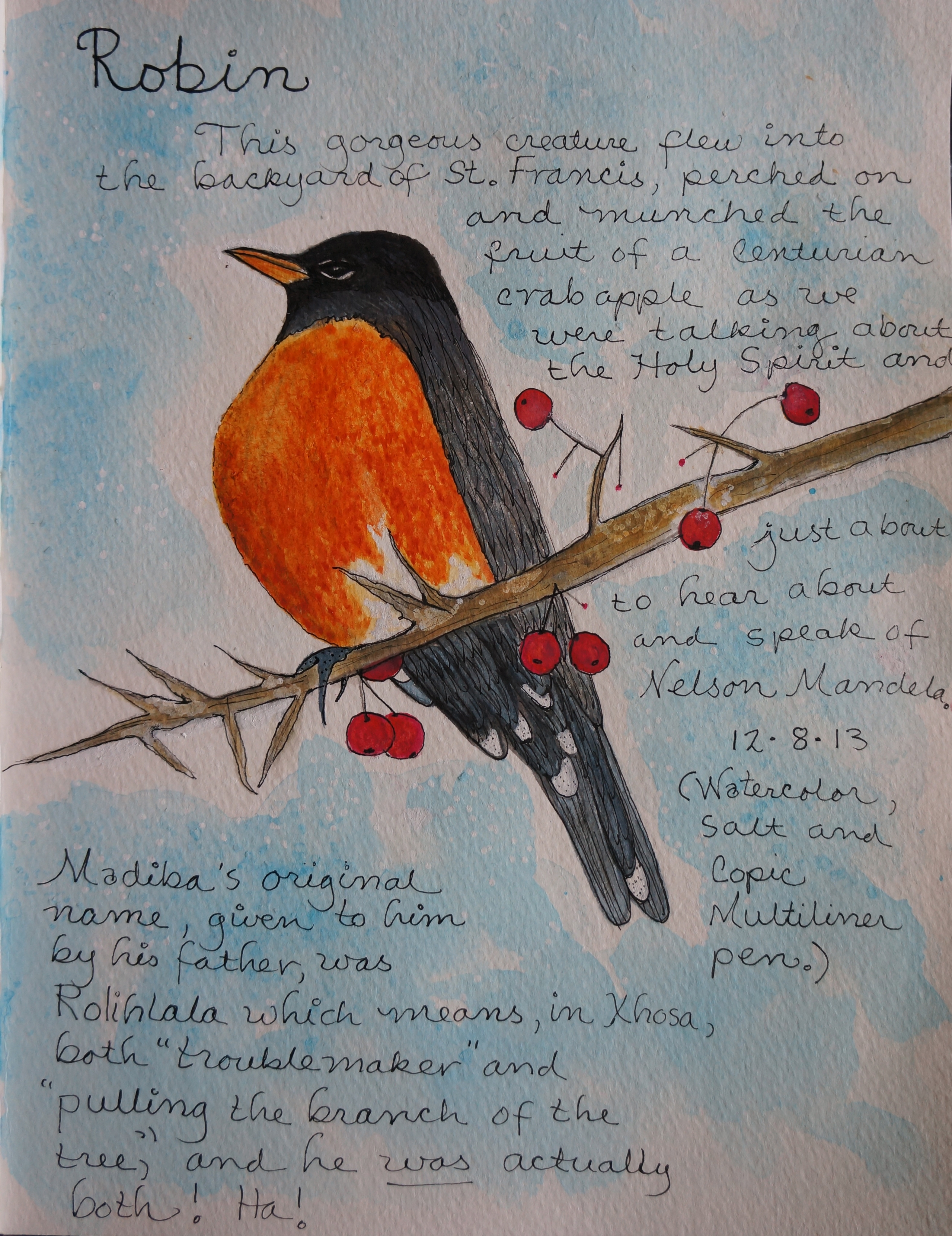 A few days after writing the poem, some friends whom I love and I were gathered at our tiny church in front of a picture window, singing Psalm 72, “Justice will flourish in his time, and fullness of peace forever.” Just then, a flamingly handsome robin alighted on the branch of a crabapple that grew right outside the window and, looking directly at the delighted singers, he began pulling on the red fruit, bending the branch of the tree in the process.