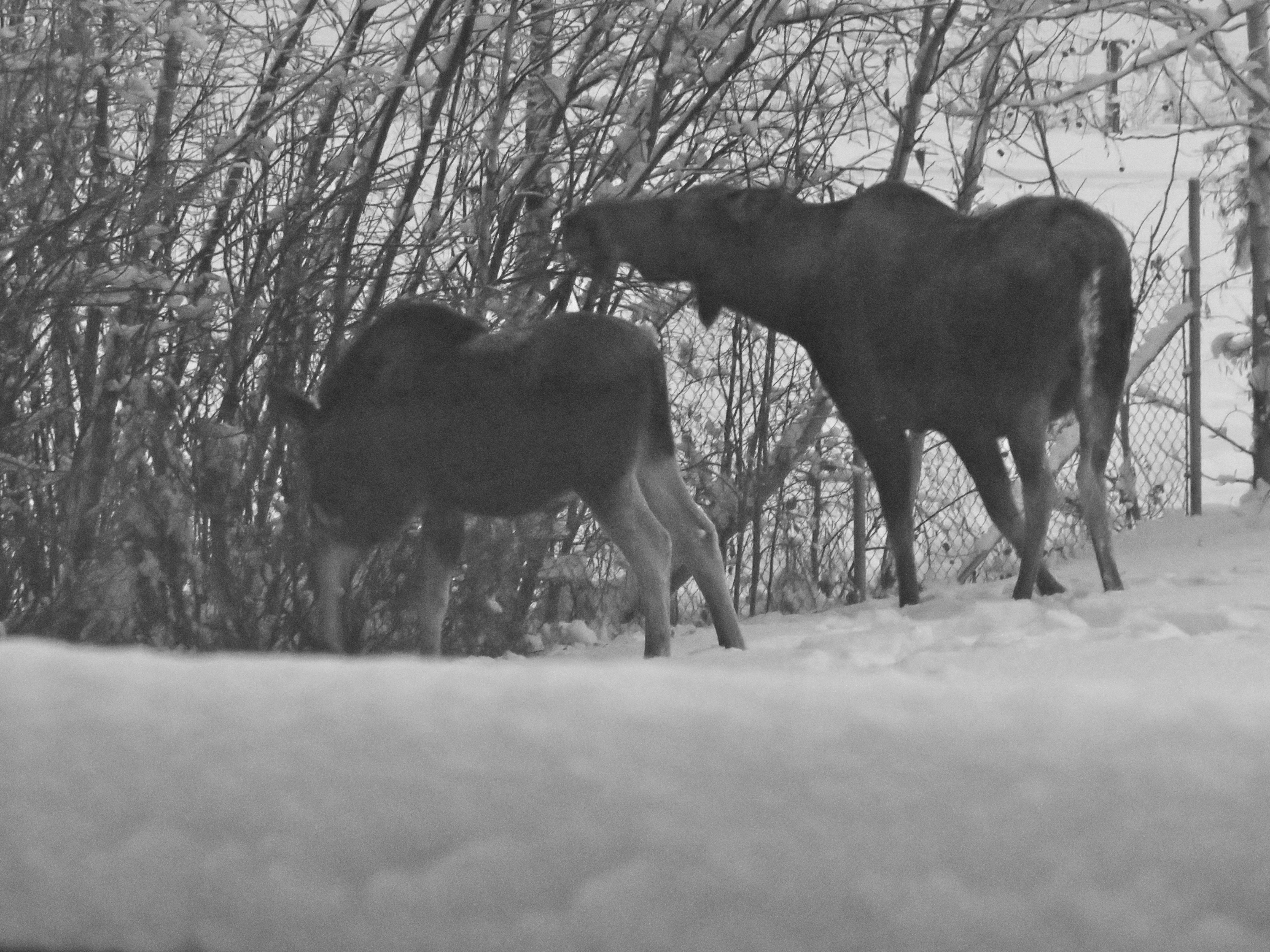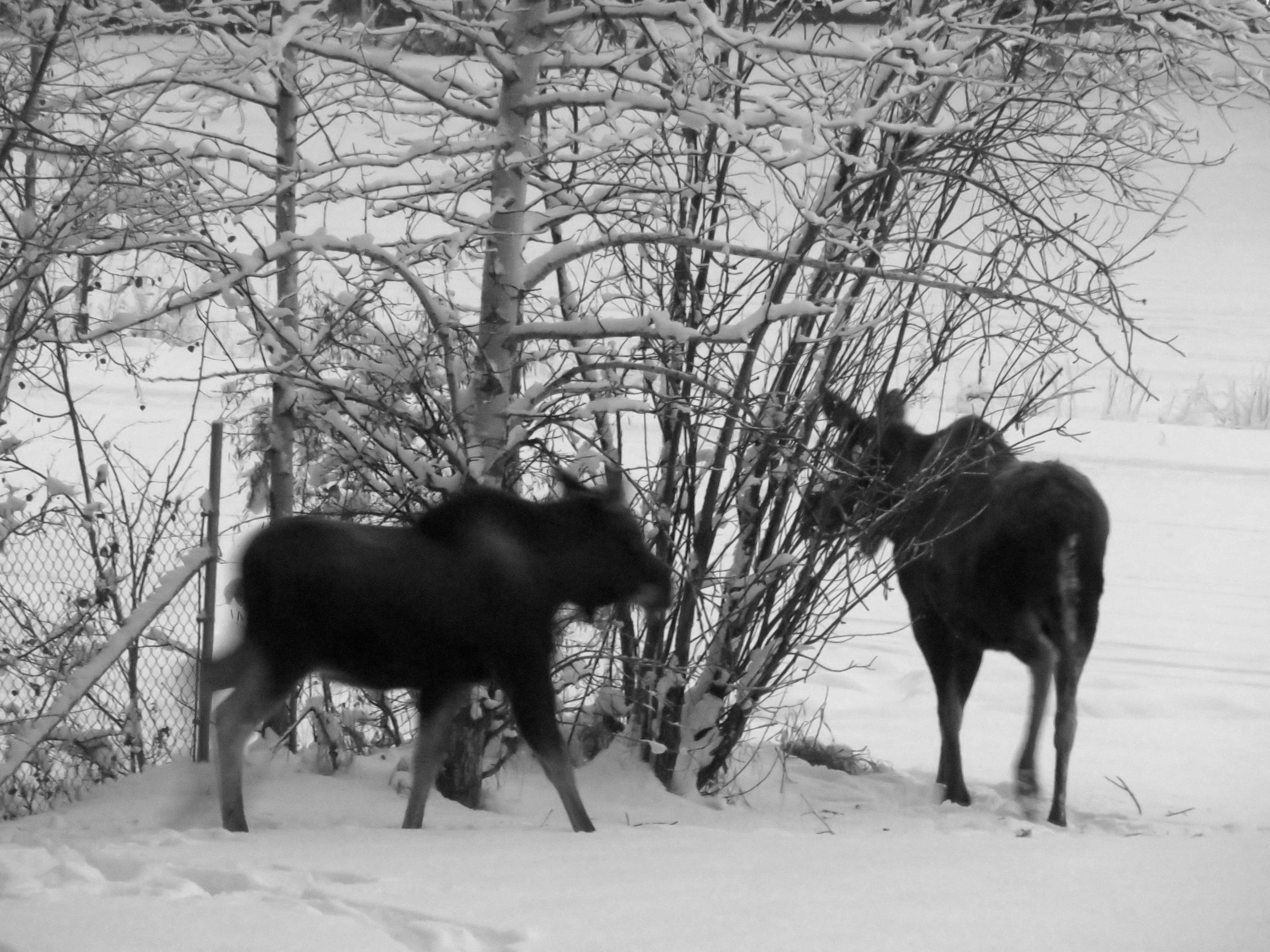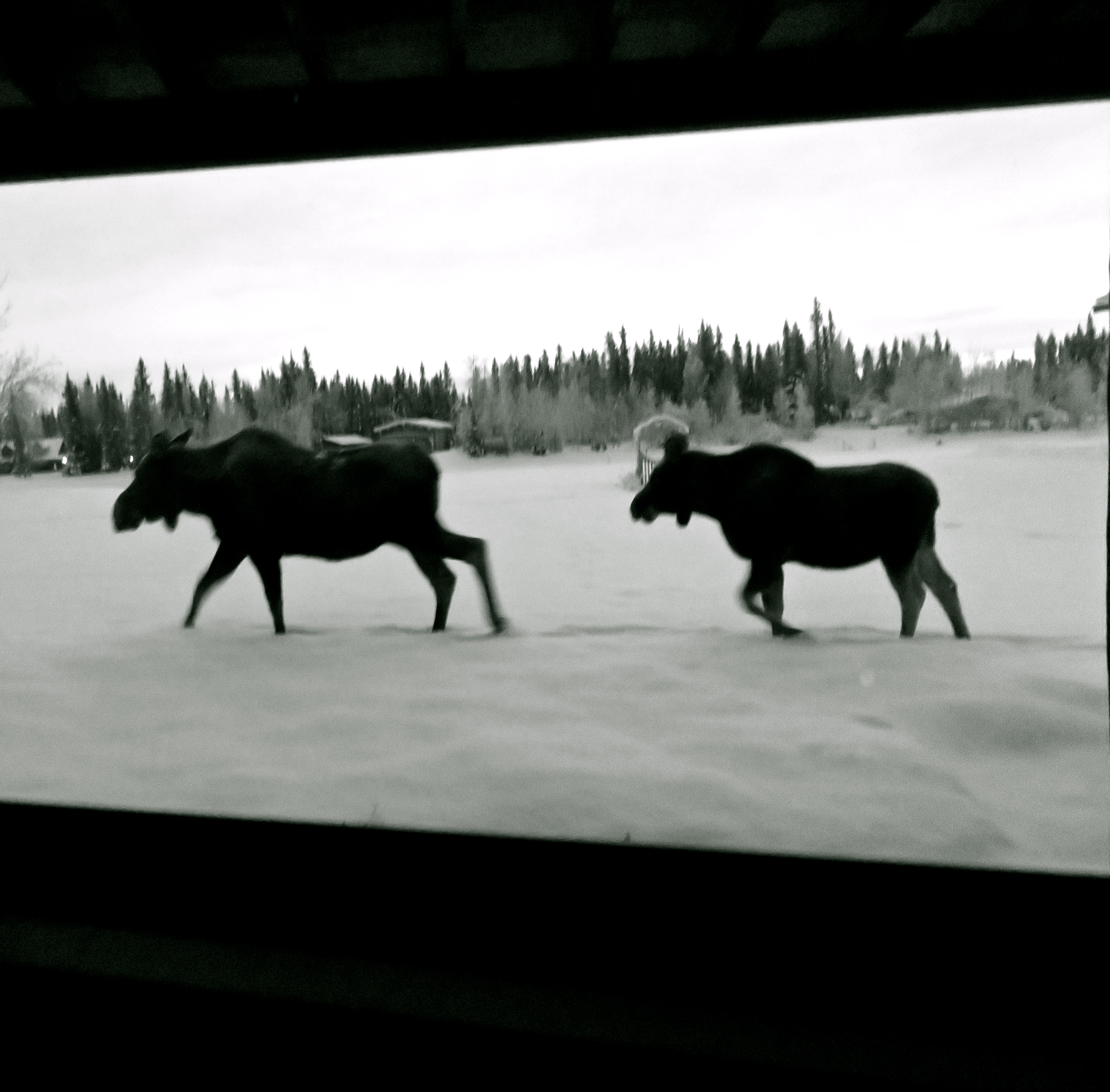 “Moose! Moose! There’re two moose!” R shouted. He never shouts, so I had a flash of a thought of that somebody’d left the front door open and a couple of thousand-pounders had wandered in out of the cold.
